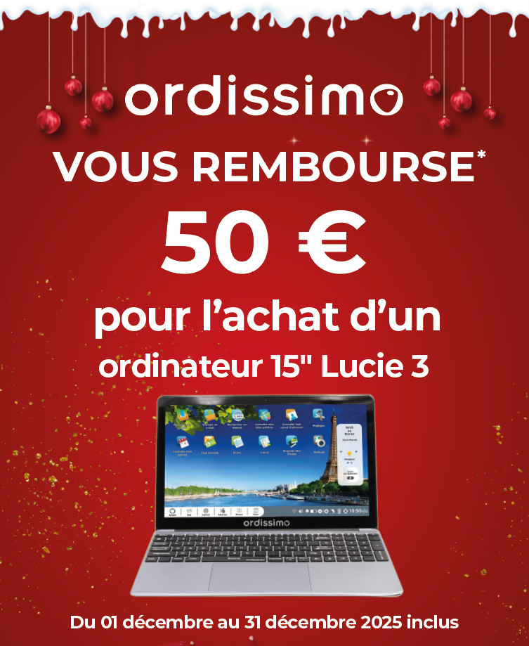 1) Achetez entre le 01 décembre 2025 et le 31 décembre 2025 inclus (la date qui figure sur la copie de la preuve d’achat faisant foi), un portable Ordissimo Lucie 3 ref ART0501.