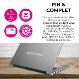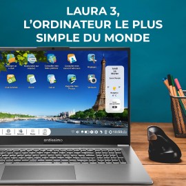 Ce modèle s’adresse à une clientèle exigeante qui désire profiter de l’interface Ordissimo avec un maximum d'options et de confort. Doté d'un grand écran FHD IPS anti-reflet de 17,3 pouces (44 cm), d'une webcam, d'un micro et hauts parleurs intégrés et d'une connexion au réseau sans fil WI-FI, le portable ORDISSIMO 17 pouces Laura 3 est un ordinateur complet et performant avec un design élégant et tout en finesse !